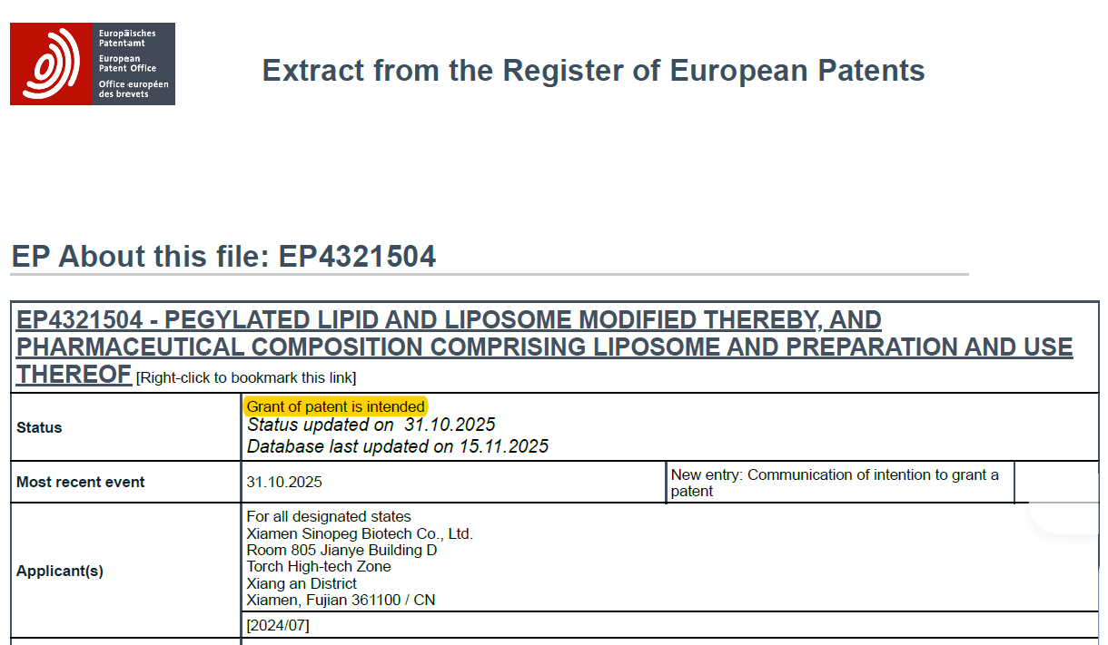 Recently, SINOPEG's self-developed products, mPEG-DTA-1 and HO-PEG-DTA-5, have been formally granted European patents! This marks the recognition of domestically produced high-end LNP excipients by the international regulatory system, laying a solid foundation for China's innovative drugs to enter the global market!