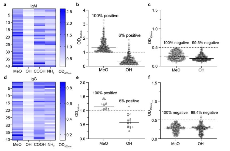 The study comprehensively used ELISA, Isothermal Titration Calorimetry (ITC), and various in vitro functional assays to systematically compare the binding characteristics of PEG materials with different terminal structures (including MeO-, HO-, NH₂-, and COOH-PEG) to antibodies. The results in the figure below show that HO-PEG exhibited the lowest immunorecognition rates across all tests, with positive binding signals reduced by over 90%. Particularly noteworthy, cross-species comparisons revealed that human pre-existing antibodies primarily recognize the PEG terminal structure, whereas antibodies induced in animal models often target the PEG repeating units. This key difference suggests that the advantages of HO-PEG are highly specific and hold significant translational potential in clinical settings.